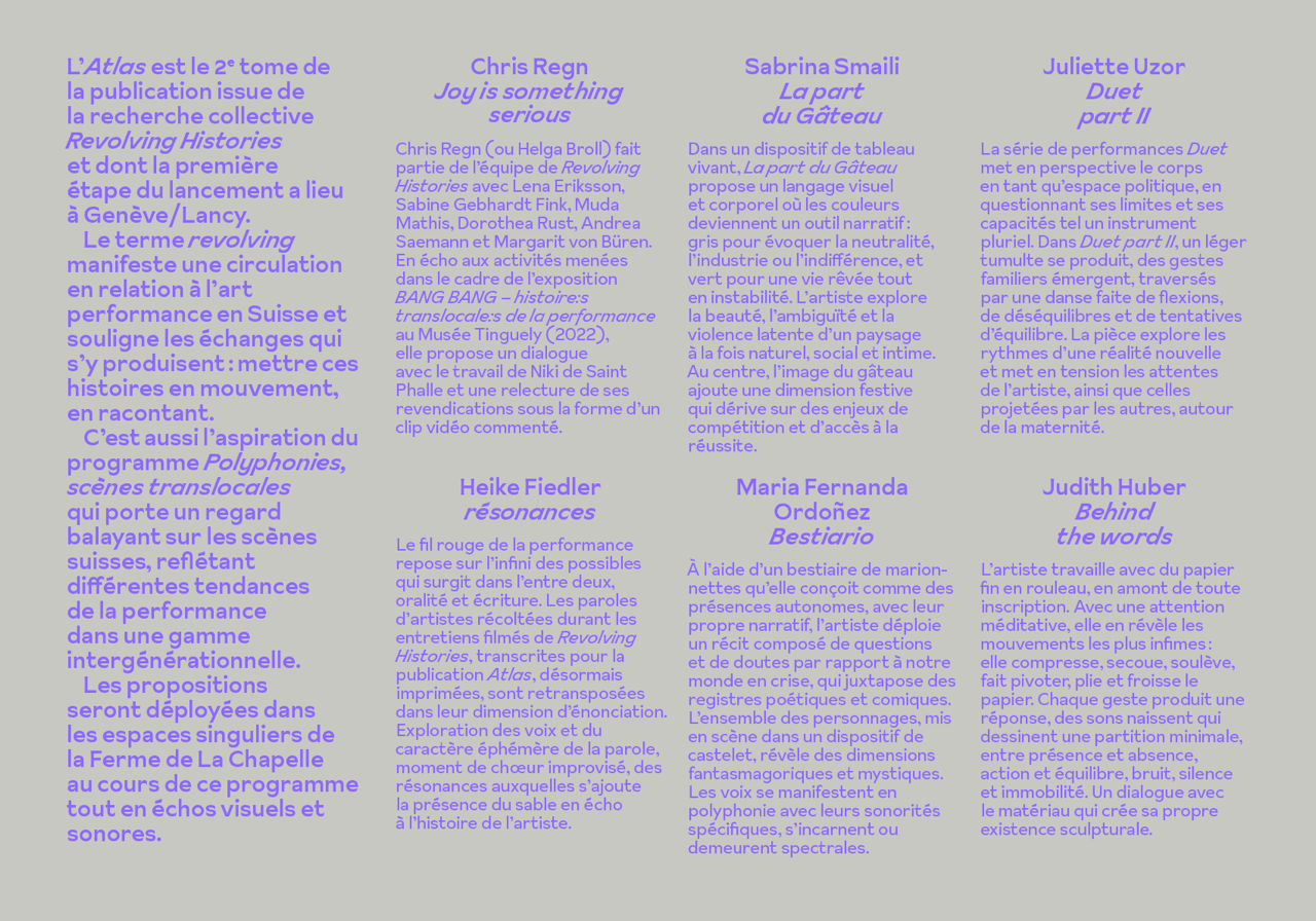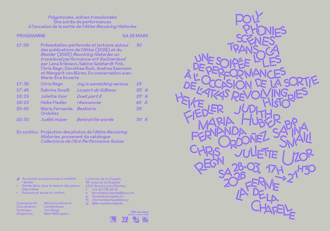 Mit einer Präsentation der Publikationen Revovling Histories und einem Gespräch mit Marie-Ève Knoerle und Performances von Heike Fiedler, Judith Huber, Maria Fernanda Ordoñez, Chris Regn, Sabrina Smaili, Juliette Uzor, kuratiert von Marie-Ève Knoerle